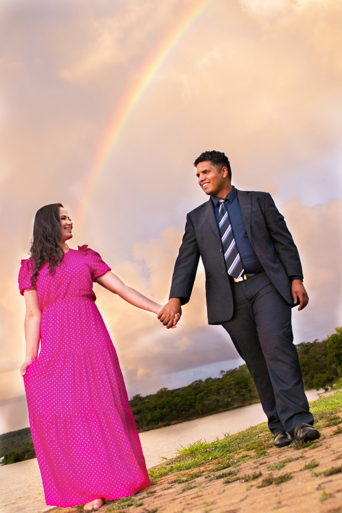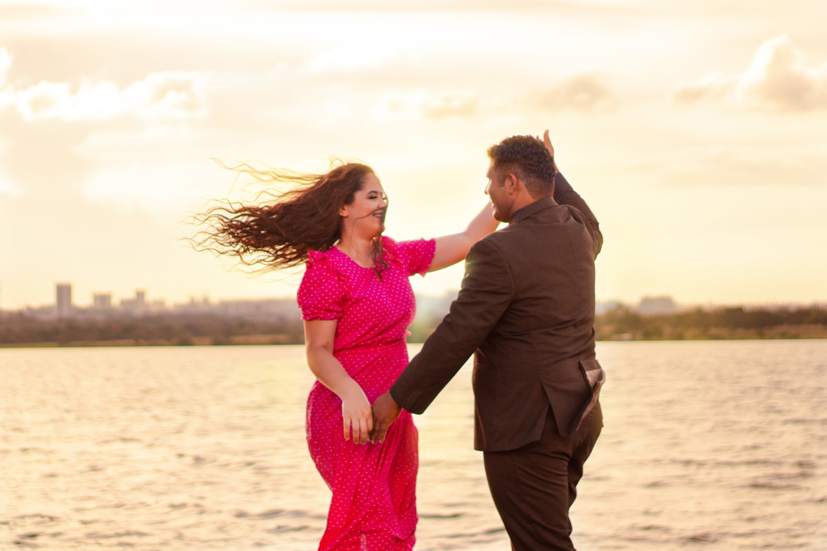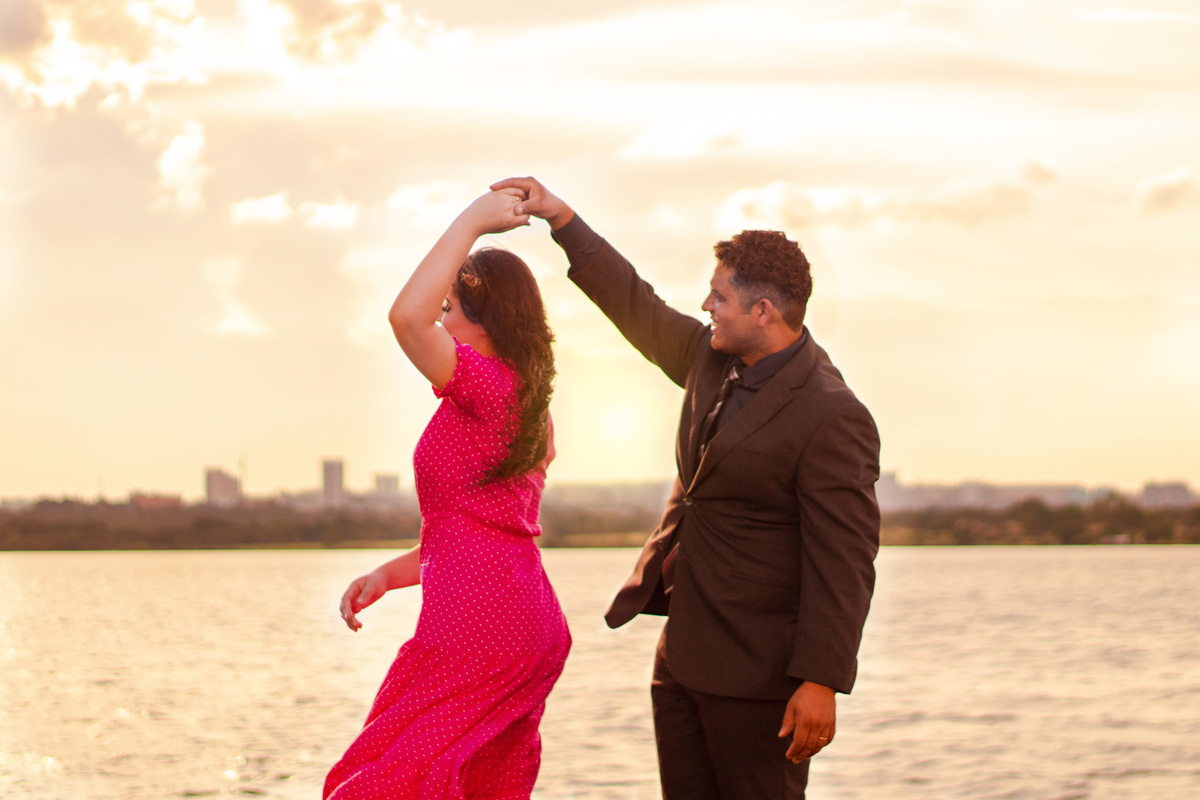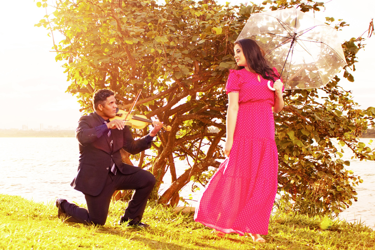 Escolhemos a Ermida Dom Bosco como cenário. Exploramos os locais com árvores, o lago Paranoá, o pôr do sol lindíssimo, e no final ainda fomos presenteados com um arco-íris!