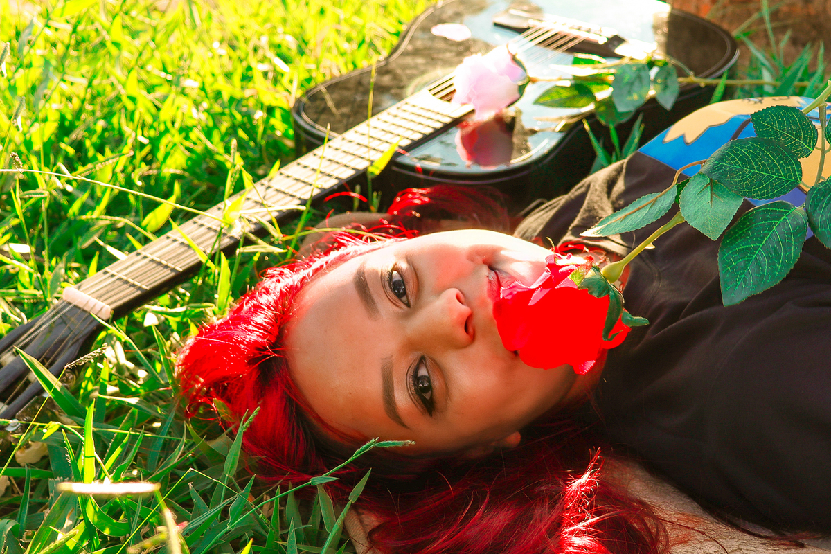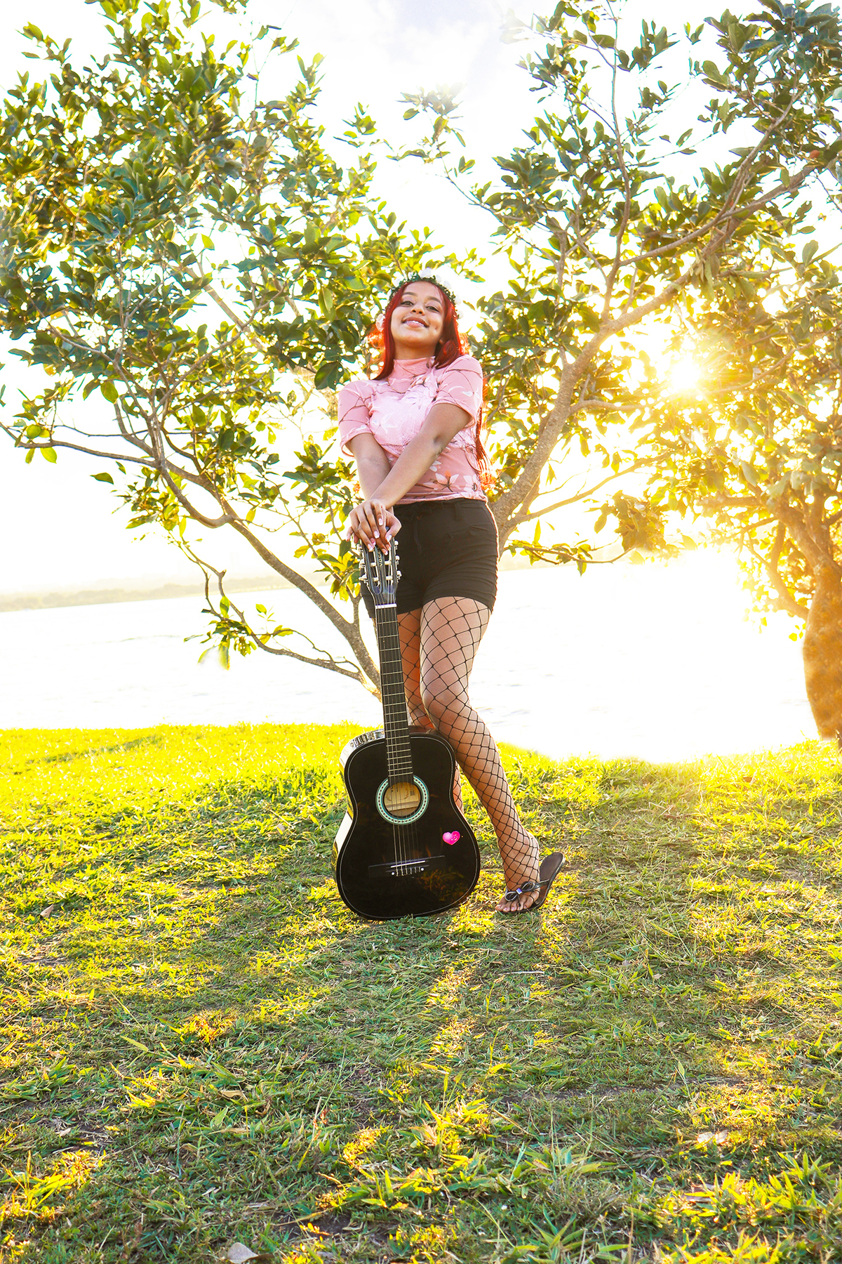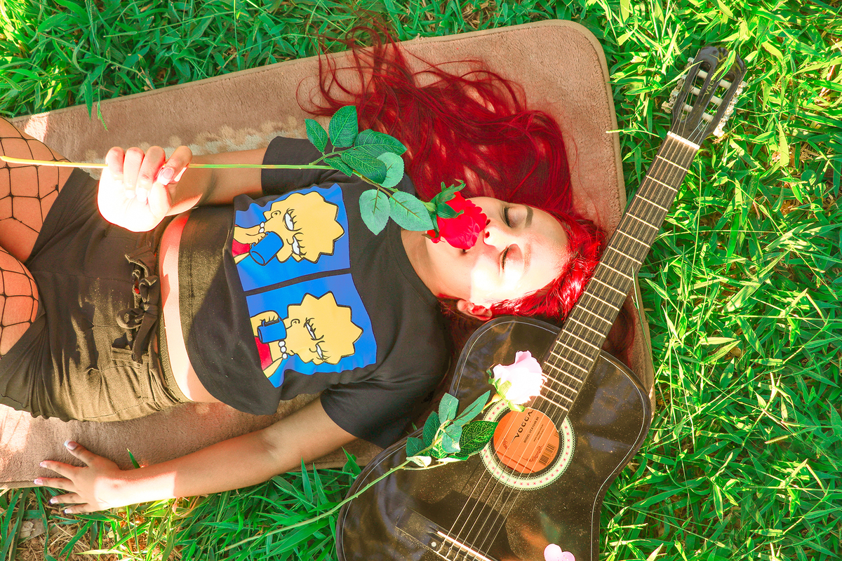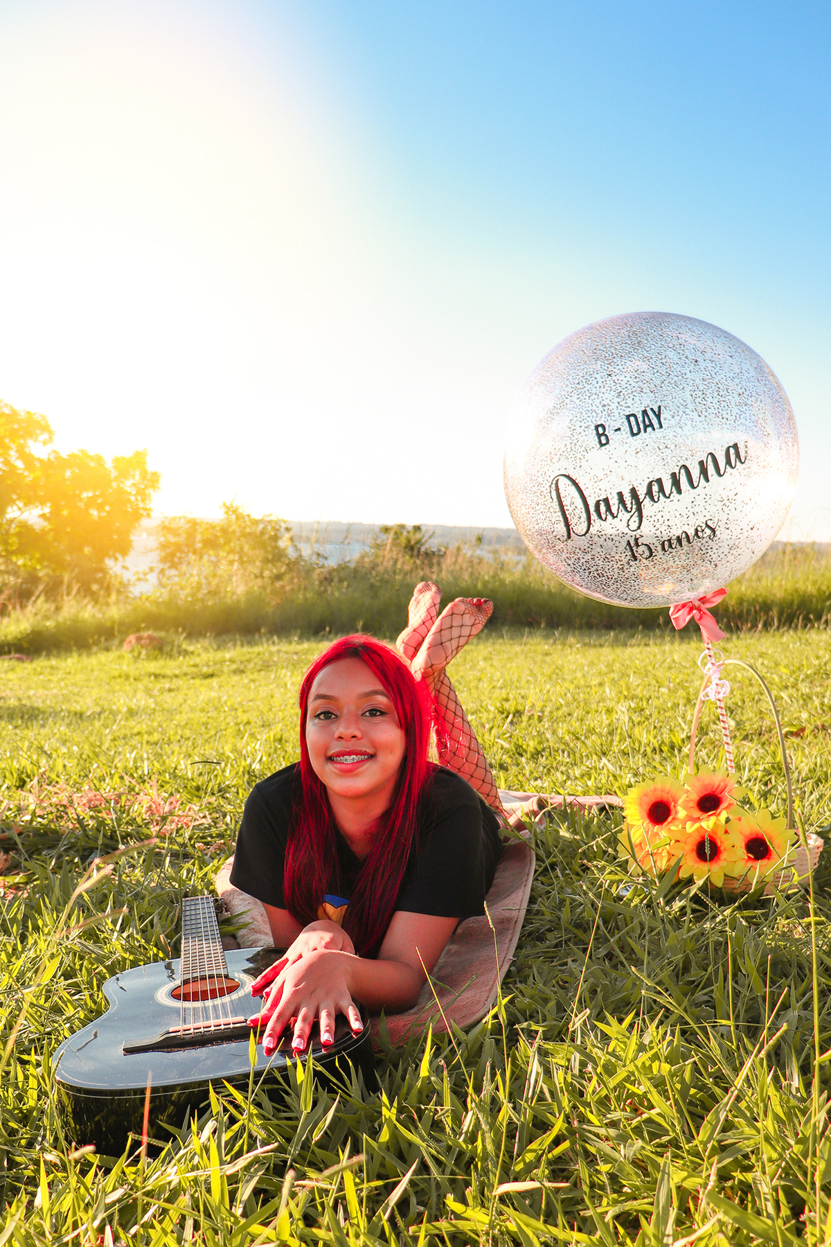 A Dayanna levou várias coisinhas que gostaria de usar para as fotos, como balões, um violão, livros... Eu adoro utilizar objetos que têm a ver com a personalidade da cliente, o ensaio fica a cara dela!